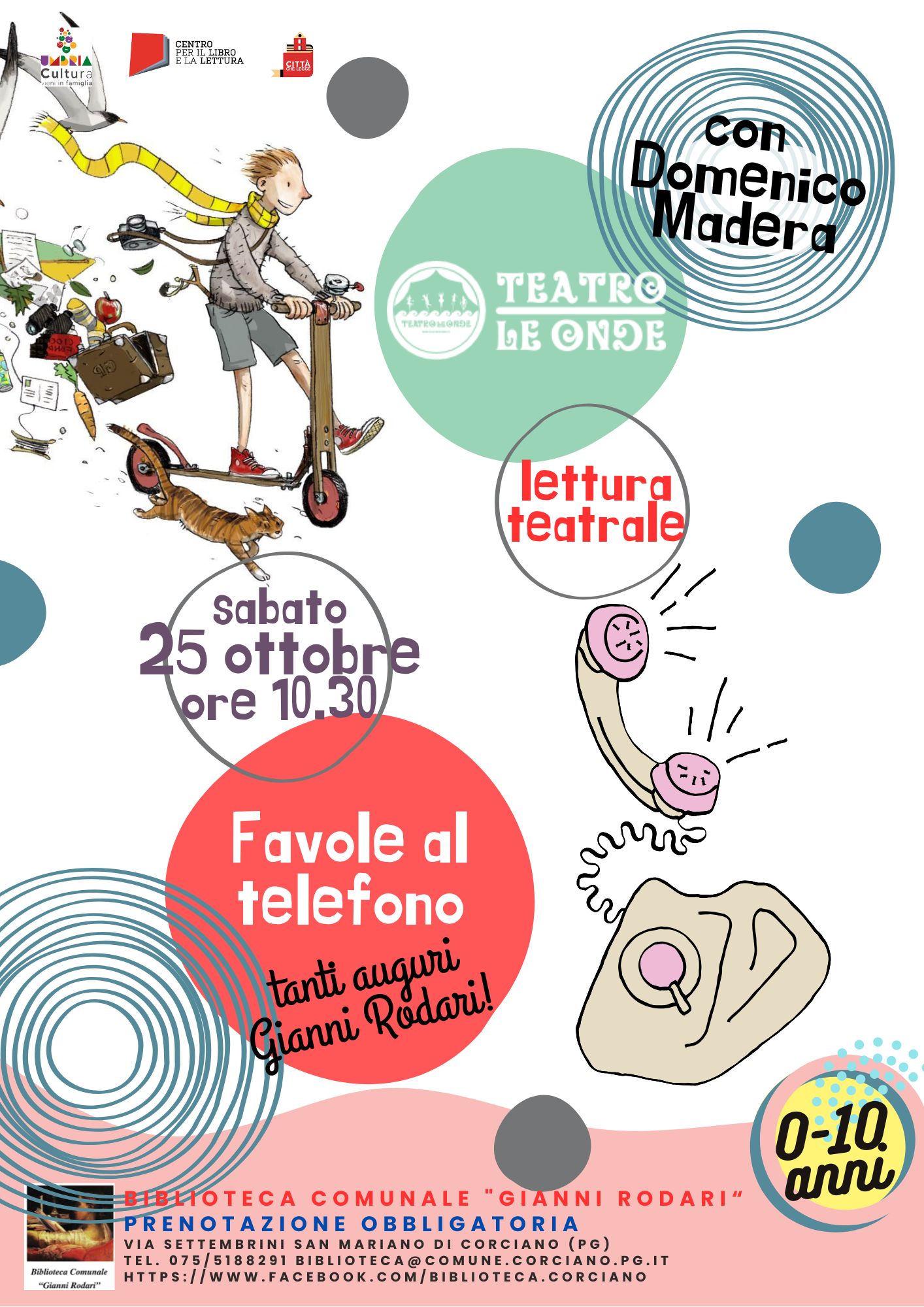 Vi aspettiamo alla Biblioteca Comunale "Gianni Rodari" per un’emozionante lettura teatrale ispirata alle celebri "Favole al telefono" di Gianni Rodari! In compagnia di Domenico Madera de il "Teatro le onde" Prenotate ai nostri contatti 0755188291 oppure biblioteca@comune.corciano.pg.it